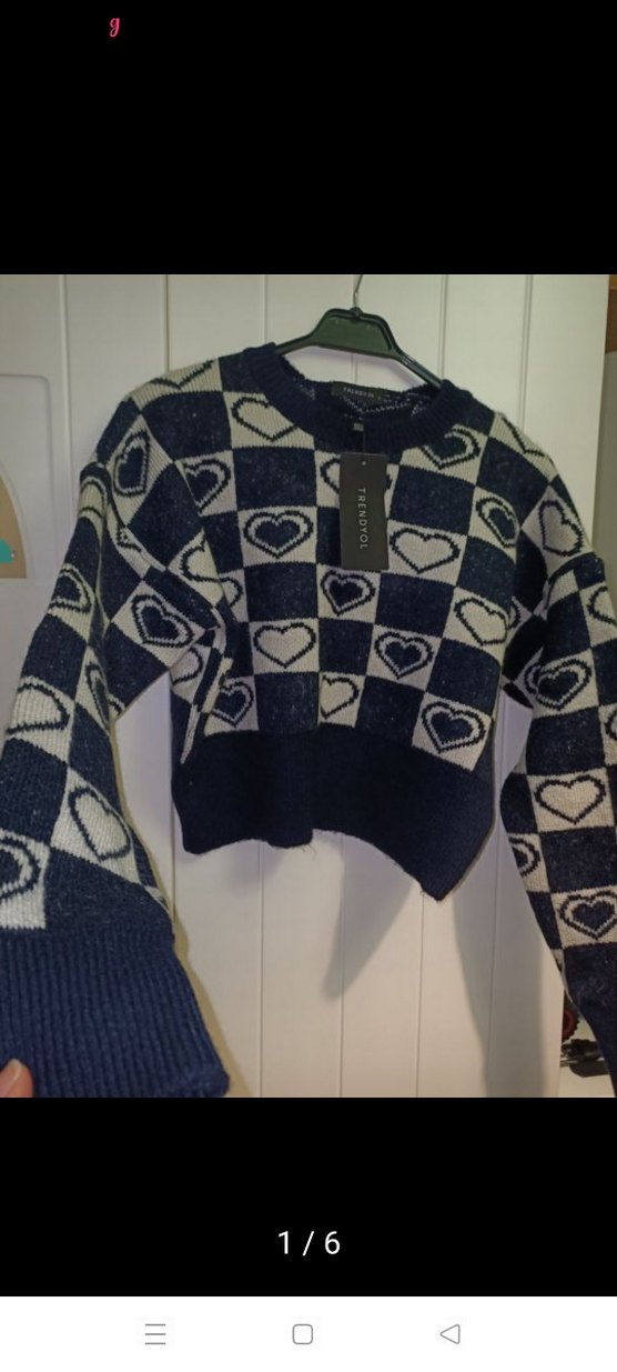 Bu kadın kazak, kalp desenli koyu kareli örgü kumaştan üretilmiştir. Yuvarlak yaka, uzun kollu ve rahat, kısa kesimdir. Sokak stiline uygundur.
