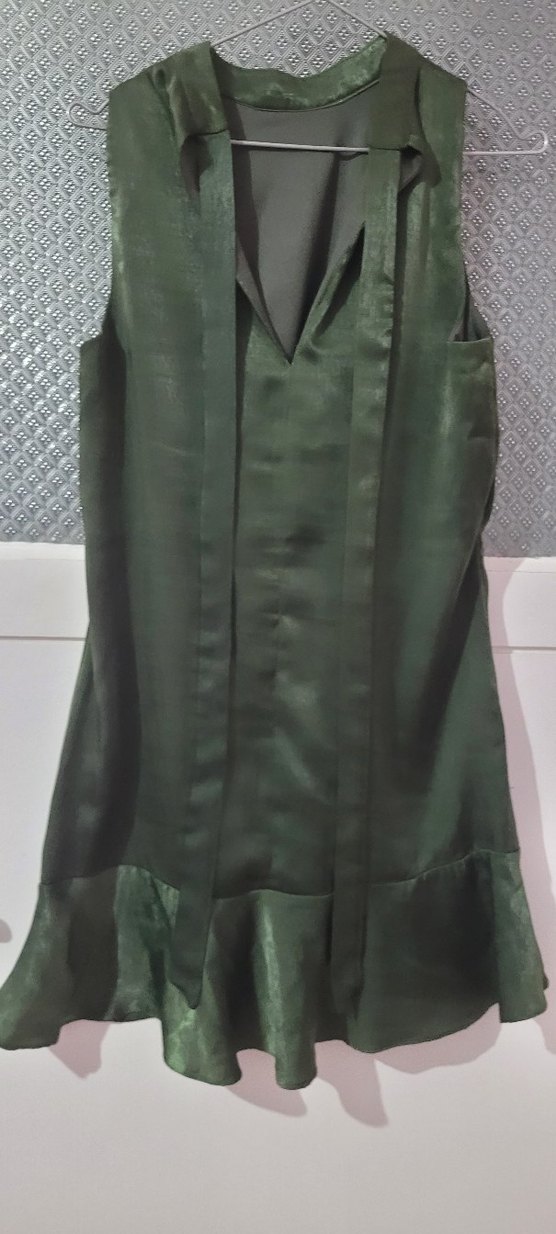 Kolsuz, V yakalı, koyu yeşil renkte uzun abiye elbise. Etek ucunda volan detayı bulunur. Düzenli kesim, çağdaş ve Paris tarzı, ofis ve gece için uygun trenyol haki yesil saten ucu furfirli hakim yaka ipli elbise 36 beden ama 38 de olur çok sık durusu vardir tiril tiril sayılı giyildi kusuru yok ölçüler fotolarda mevcuttur