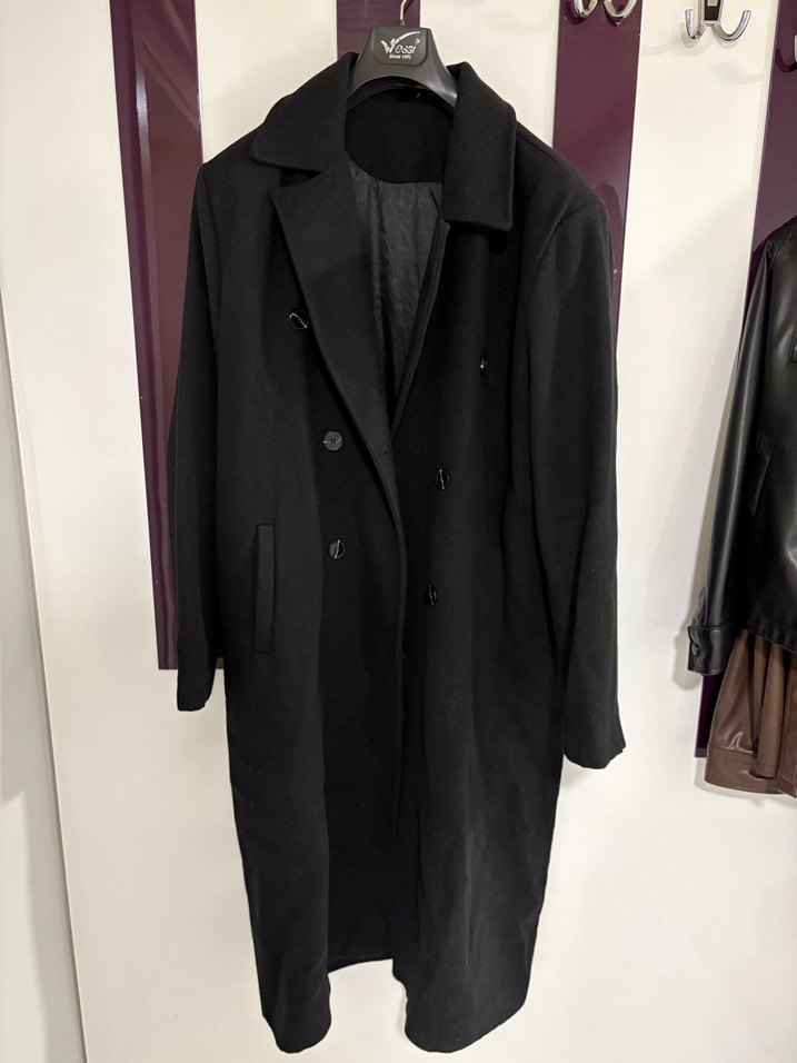 Siyah, çift düğmeli uzun kaban, klasik yaka ve yan ceplere sahiptir. Şık ve sade tasarımlıdır.