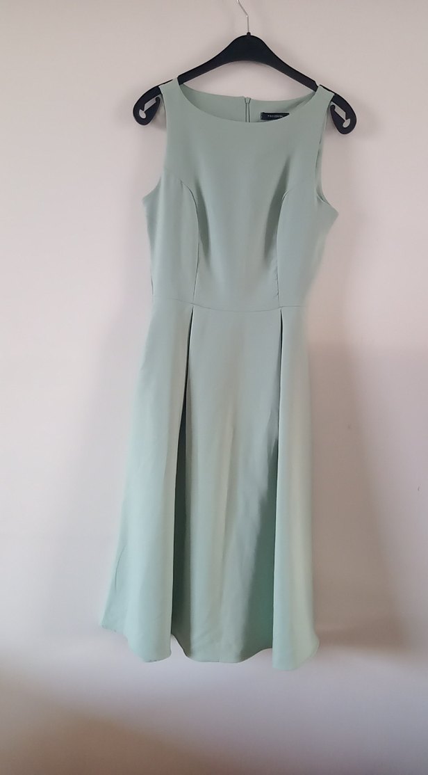 Çağla yeşili renkte uzun, kolsuz, drapeli ve yuvarlak yaka , pileli kadın elbisesidir. Düzenli kesimi ve modern klasik stiliyle ofis kullanımı için uygundur. Minimalist ve desensizdir. iki tarafında da cebi mevcuttur. astarsızdır ancak kalın kumaş olduğu için iç göstermez iki koltuk altı arası 46 cm omuzdan aşağıya doğru 115 cm