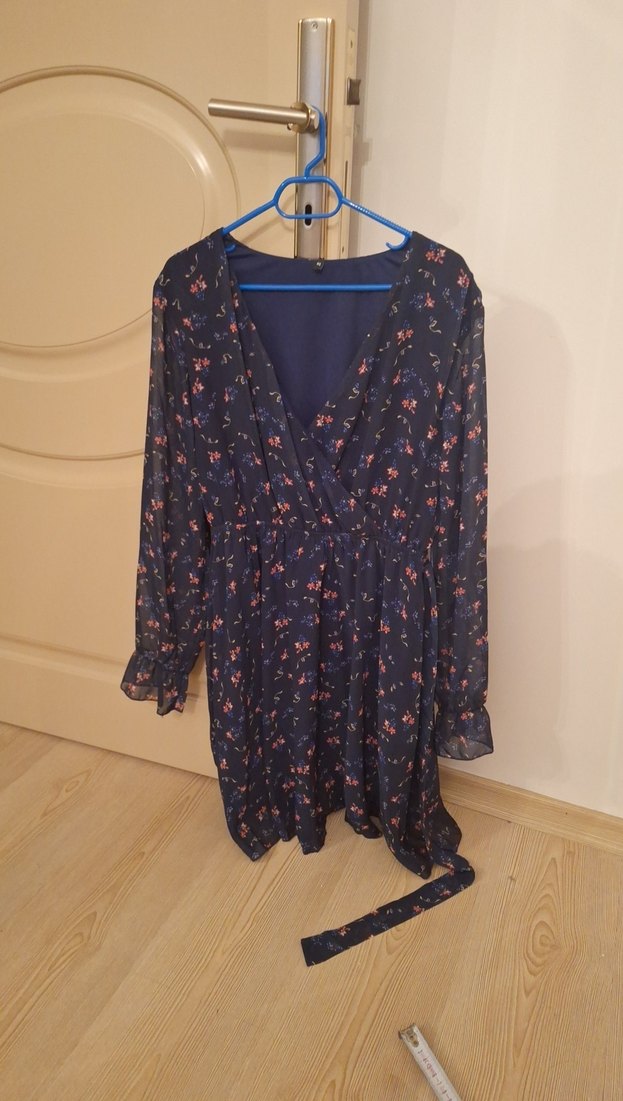 Mavi renkli midi boy elbise, bol kesim ve drapeli tasarıma sahip. V yakalı, uzun kollu ve baskılıdır. Paris esintili bohem tarzıyla günlük kullanıma uygundur.