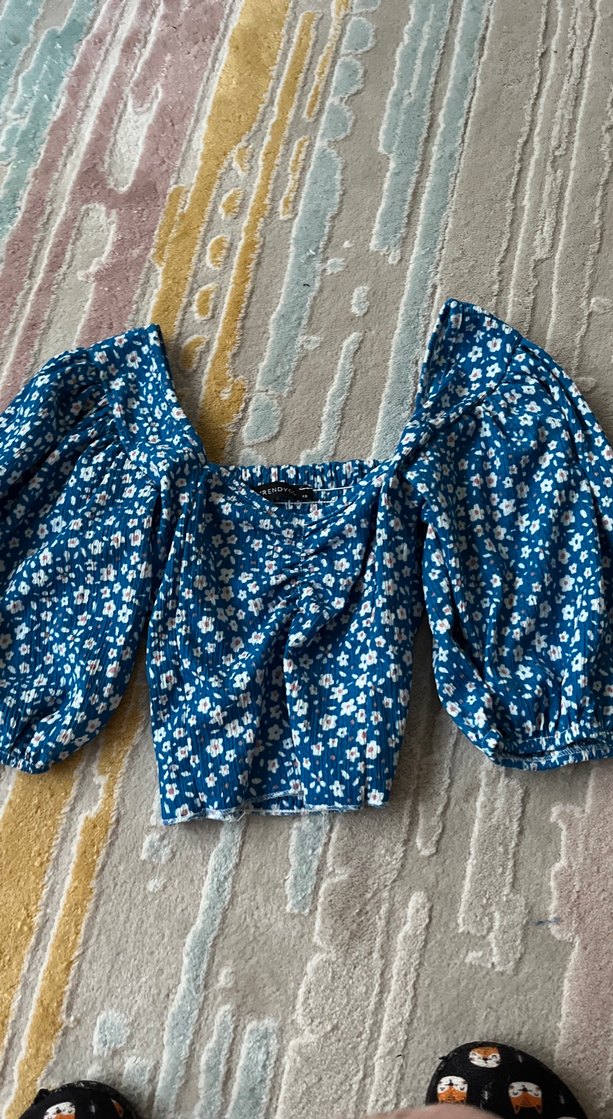 Trendyol Mavi Çiçekli Balon Kol Bohem Bluz