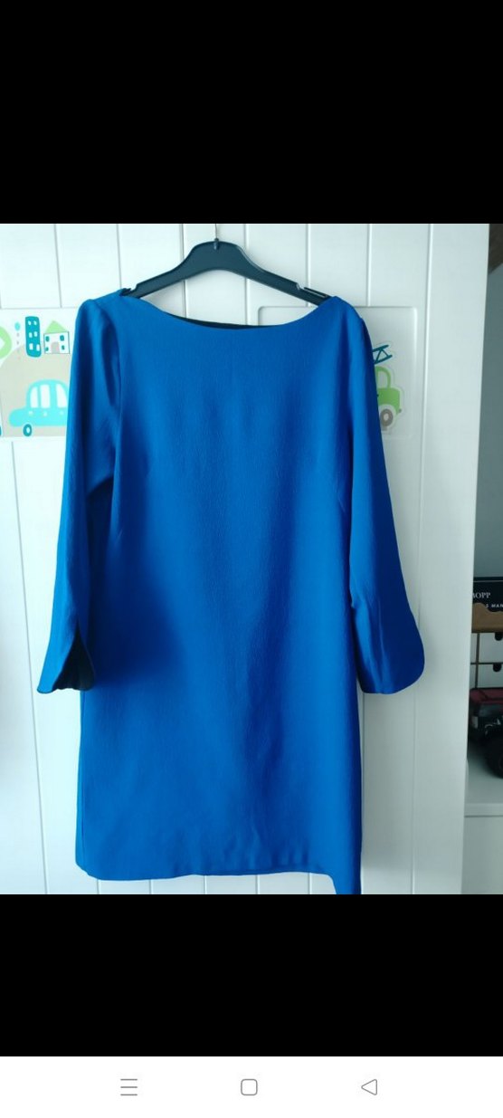 Mavi midi uzun kollu, salaş kesim, drapeli, yuvarlak yakalı elbise. Sentetik kumaştan olup, ofis için uygundur. 38 bedendir.