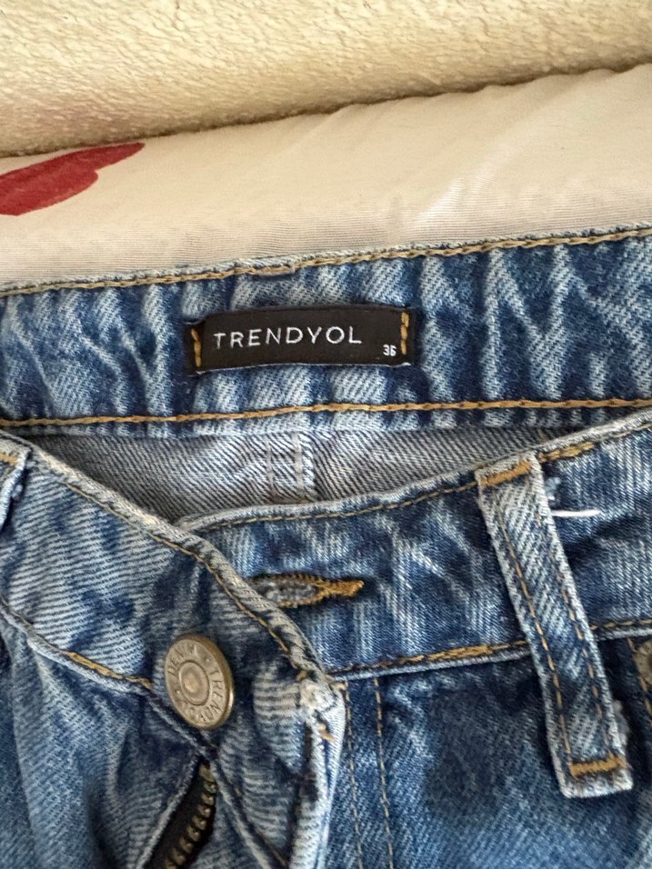 TRENDYOL marka, mavi tie-dye desenli, düğmeli, normal kesim midi uzunluğunda kadın kot pantolon. Günlük kullanıma uygundur.