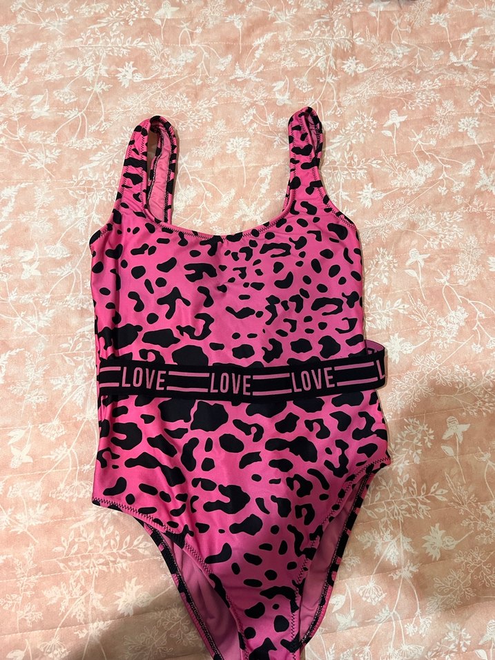 Trendyol Renkli pembe ve siyah desenli,, ince askılı ve 'LOVE' yazılı kemerli, kısa kesim kadın mayo.
