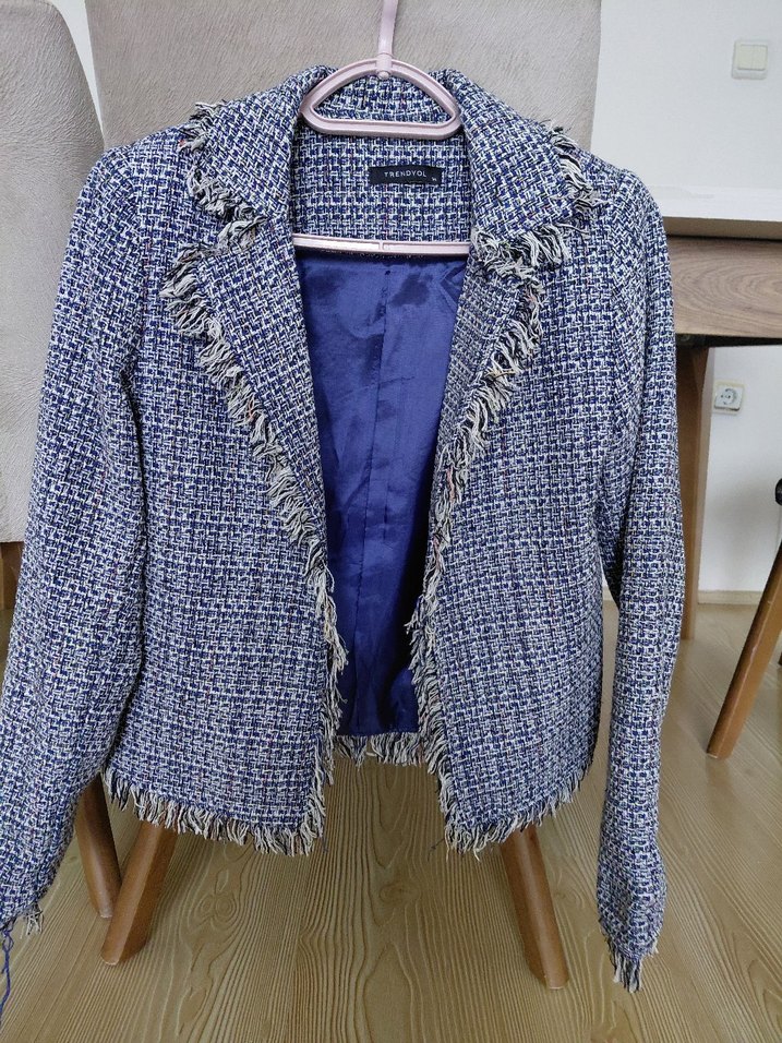 En fazla 2 kez giydim tertemiz sorunsuz 34 beden kısa ceket. Hafif kalın değil, çok dar da değil, iki koltuk altı arası 44-45 cm , boy 50 cm
