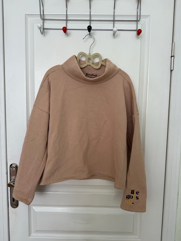Bej renk, yuvarlak yaka ve uzun kollu, bol kesim sweatshirt. Yumuşak ve sıcak kumaştan, kolunda küçük 'gos' detayı ile sade tasarım. Rahat ve şık sokak stili için uygun.