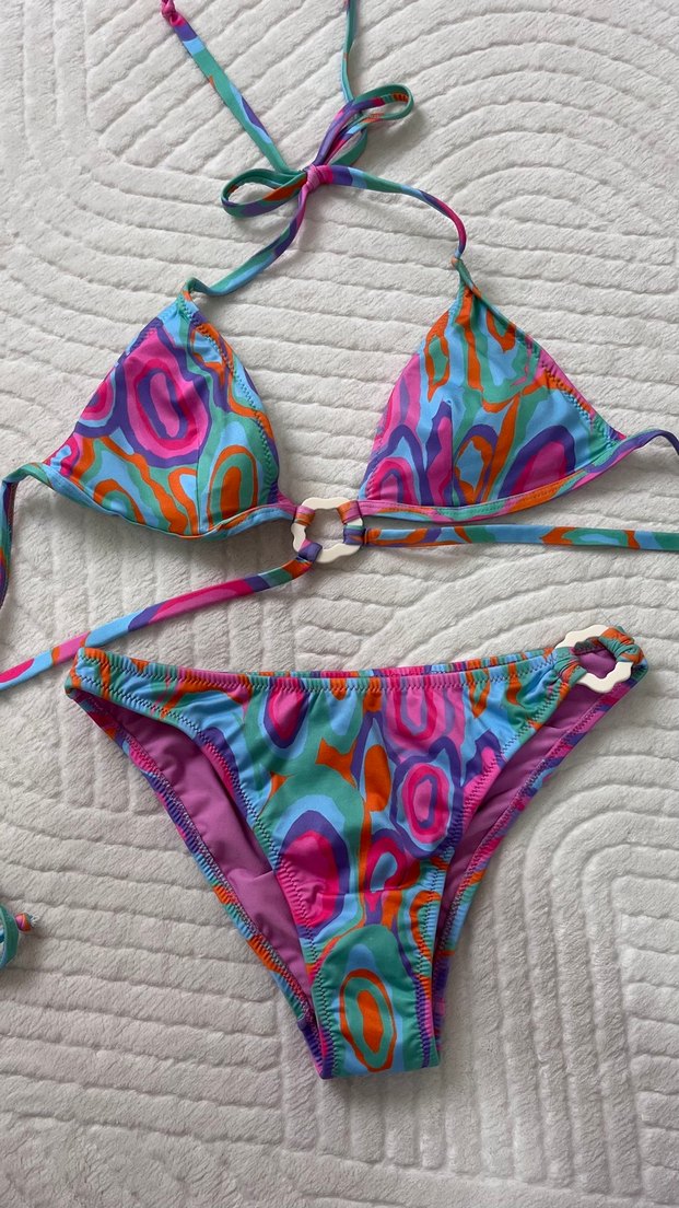 Bağlamalı ve tokalı detaylara sahip, renkli tie-dye desenli, vücuda oturan mini bikini, plaj için bohem tarzda. Üst ve alt beden 36’dır.