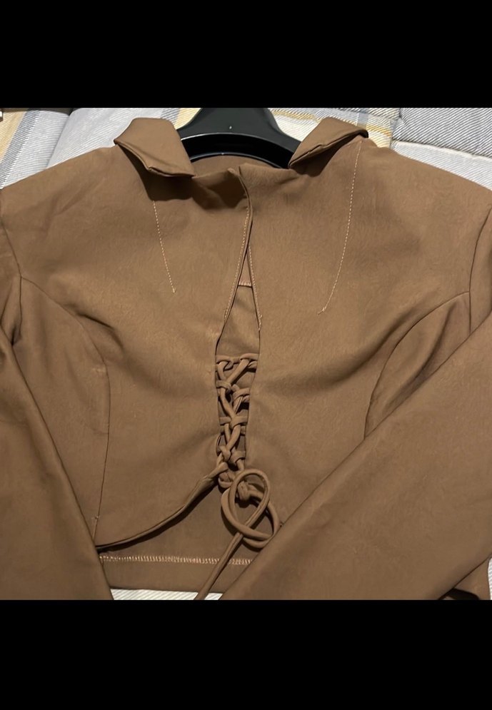 Kahverengi V yaka ve düğmeli ön kısmı olan, uzun kollu ve vücuda oturan midi boy sokak stili bluz. S ve m medene uygun