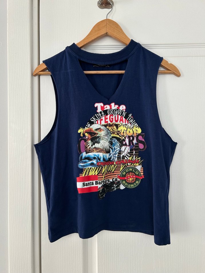 Lacivert renkte, V yaka ve kolsuz olan bu kadın atlet, bol kesim ve baskılı desenlere sahiptir. Rock punk tarzını yansıtır, günlük ve spor kullanıma uygundur. Fotoğraflarda görüldüğü gibi herhangi bir sorunu yoktur