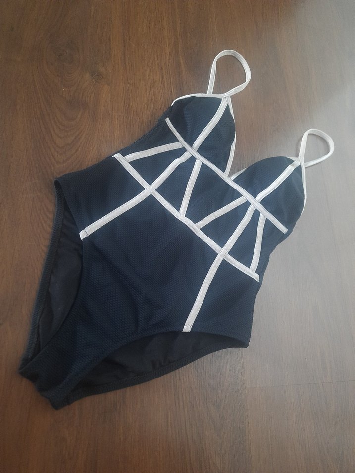 Beyaz şerit detaylı, strappy tasarımlı, lacivert ve vücuda oturan midi uzunlukta mayo. Sahilde şık gotik tarz için ideal.