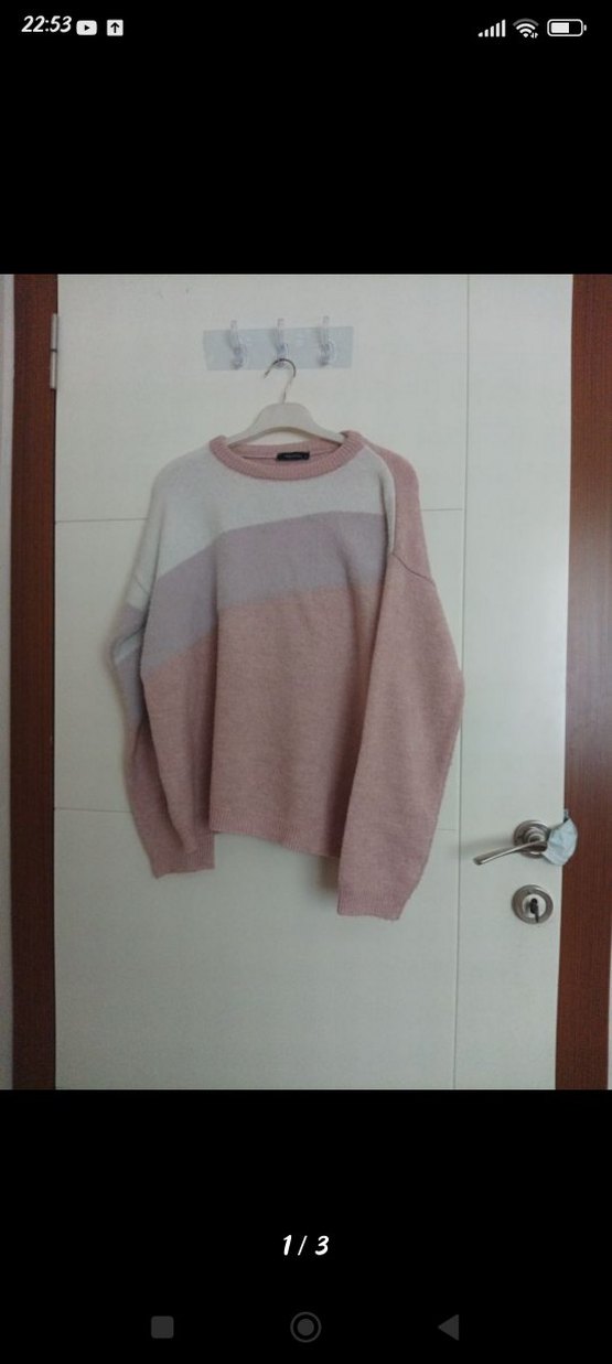Yün kumaştan, pembe pastel renkte, uzun kollu ve yuvarlak yakalı, rahat kesim triko kazak. Günlük kullanıma uygun, konforlu ve sıcak tutar. az kullanılmış kalıbı geniş s yazıo ama L bedene daha iyi olur