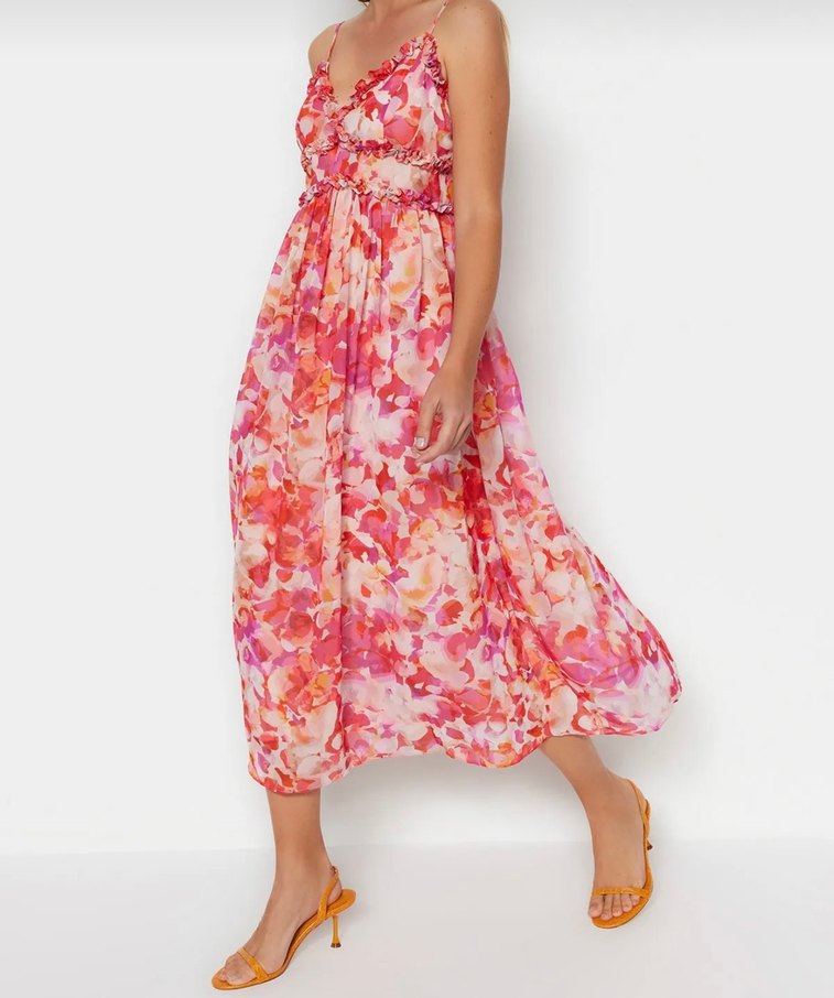 Trendyol & Milla'nın uzun, bol kesim pembe bağlamalı elbisesi, straplez yaka ve fırfır detaylara sahiptir. Yumuşak sentetik kumaştan üretilmiştir, bohem tarzına uygundur. 40 beden hamilelere uygundur