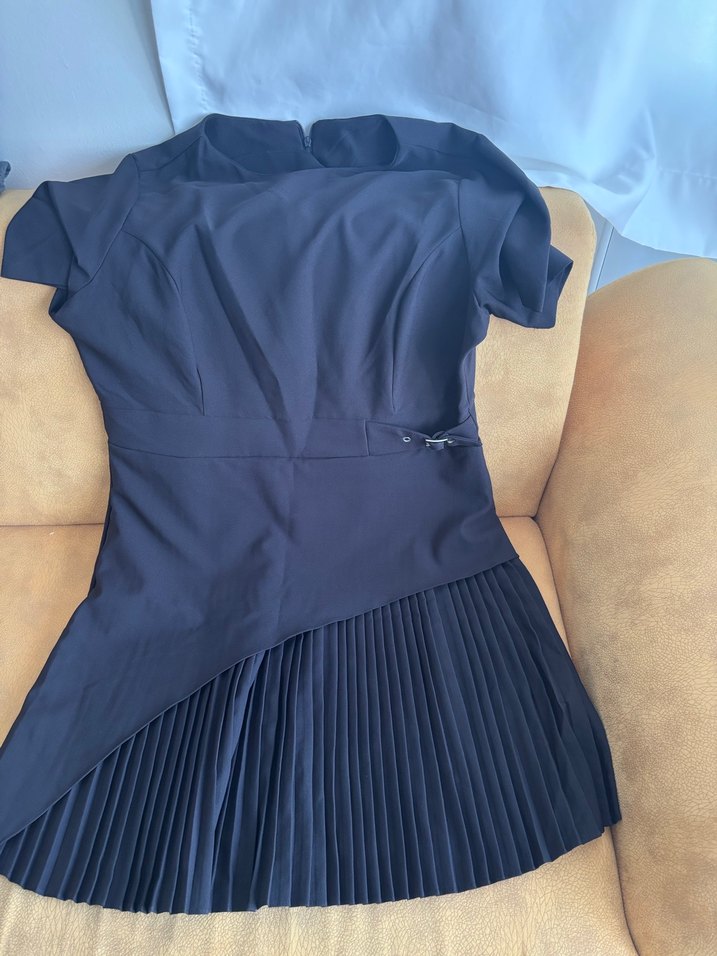 kısa kollu, yüksek yakalı, pilili etek detaylı, vücuda oturan midi elbise. Ofis kullanımı için uygun, gotik tarzda