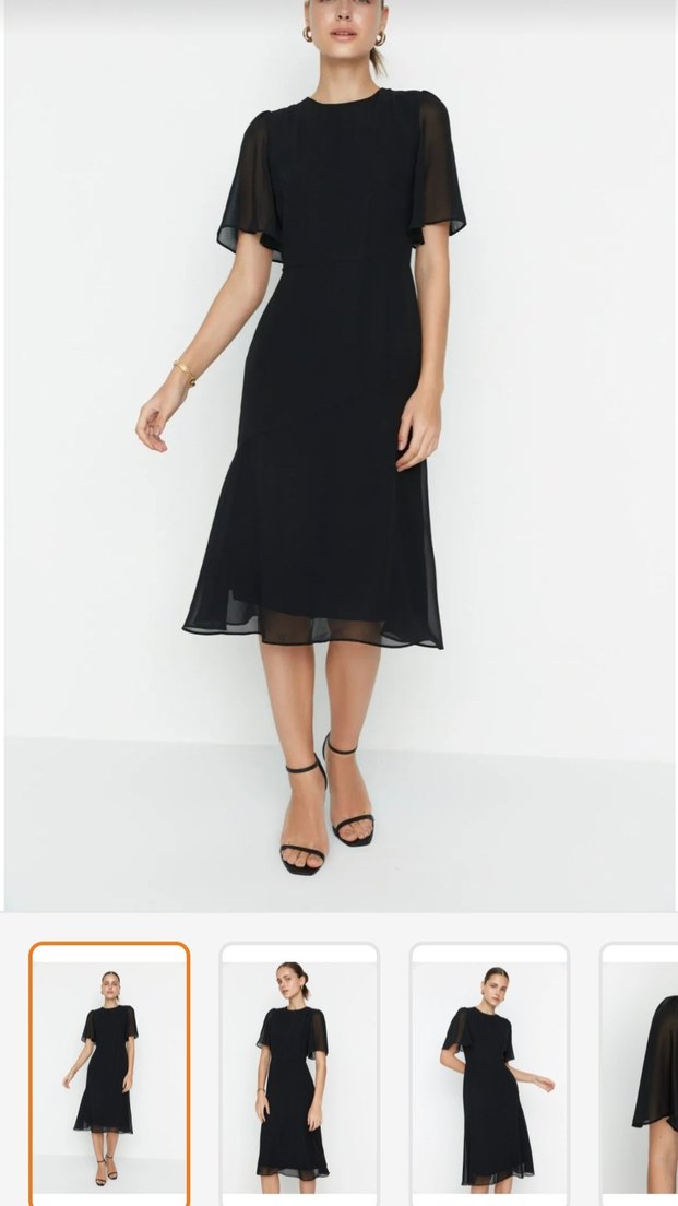Trendyol & Milla'nın siyah midi elbisesi, yuvarlak yaka ve askılı kollara sahip, drapeli detaylarla modern ve şık bir görünüm sunar. Ofis kullanımı için uygundur.