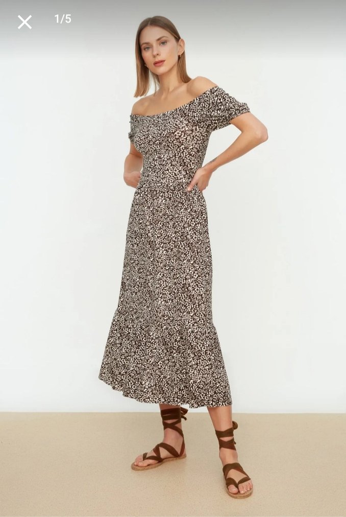 Trendyol & Milla marka,kahverengi kayık yaka ve omuzdada kullanılan günlük şık bir elbise