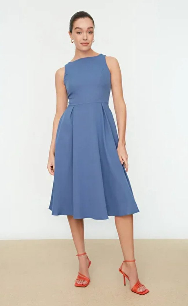 kolsuz ve tek renk midi elbise. Tekneden kesim yaka ve piliseli etek detayıyla modern klasik tarzda, ofis için uygundur.