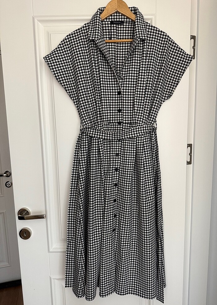 Beli kuşak kemerli, ön veya arkadan bağlanabilir. Düğmeli. Tok ve şık kumaş. Bel:38, boy:118 cm