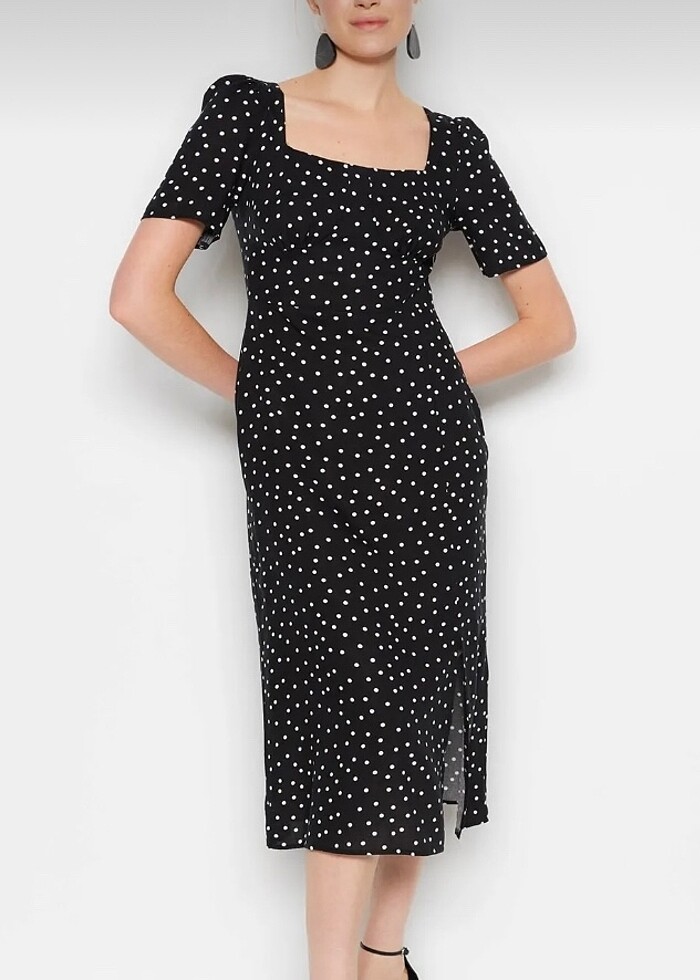 Trendyol & milla marka puantiyeli midi elbise. Yırtmaç detayı mevcuttur. Bir kere kullanıldı. 38 bedendir.