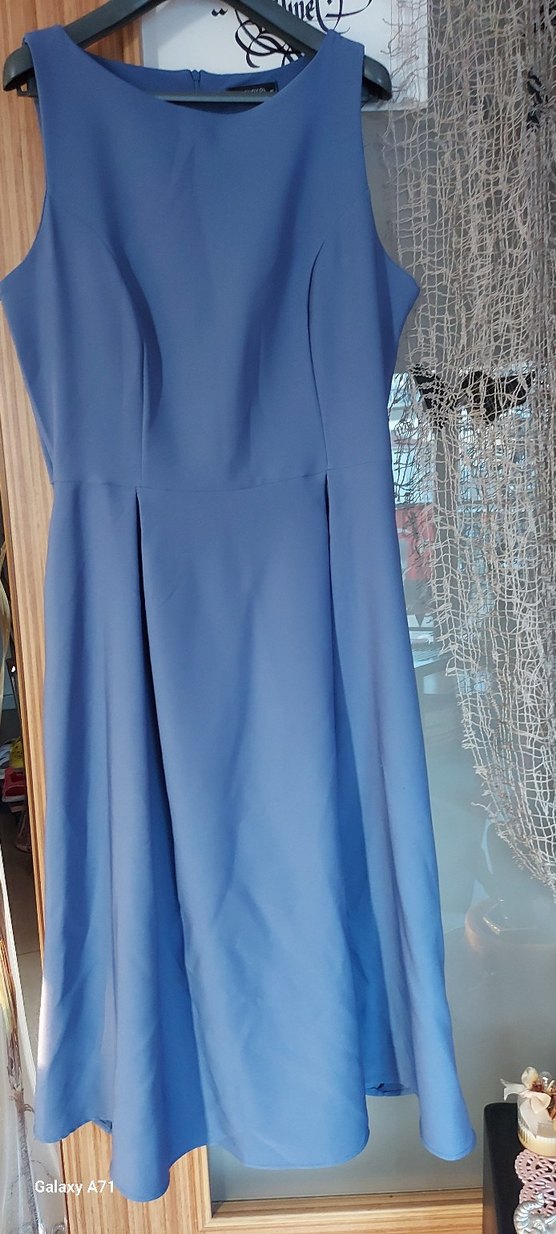 Birkaç kere giyilmiş.42 beden, indigo mavi.Yumuşacık,krep gibi bir kumaşı var.Cepli.Bele oturuyor,40 cm.Çok şık bir elbise ama birkaç yerinde belli olmayan çok minnak ip çıkmaları var.