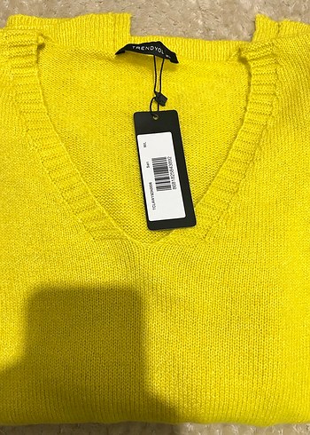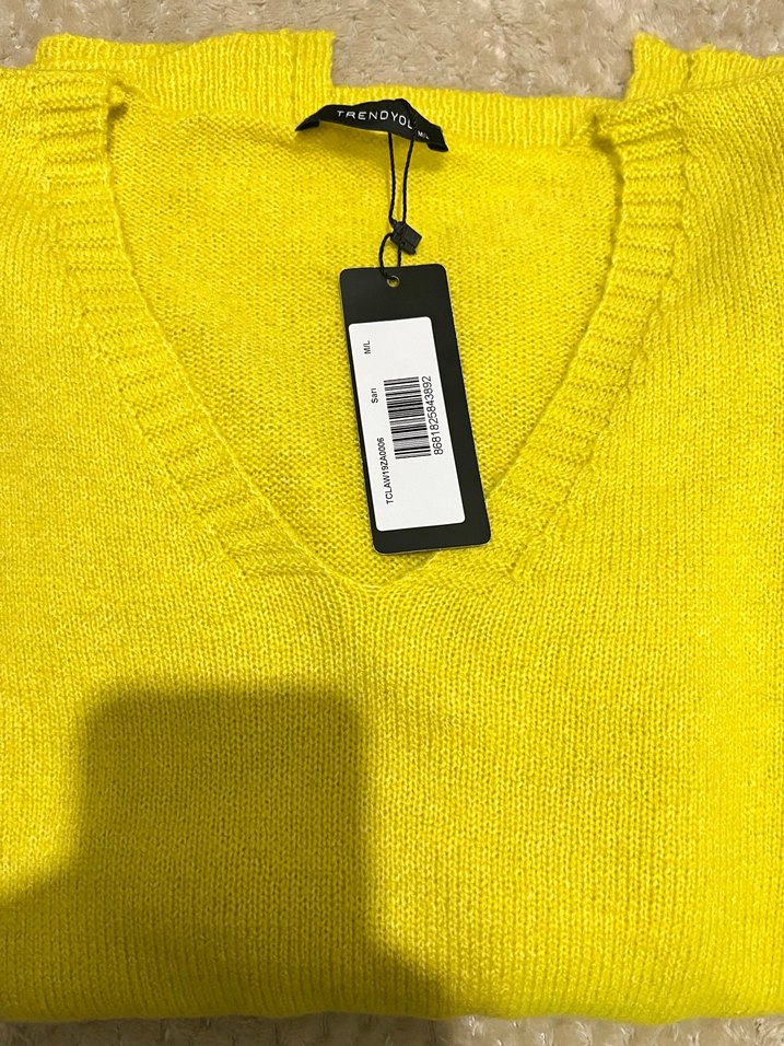 Sarı örgü yün kazak, uzun kollu ve V yaka ve oversize yeni etiketlidir. .