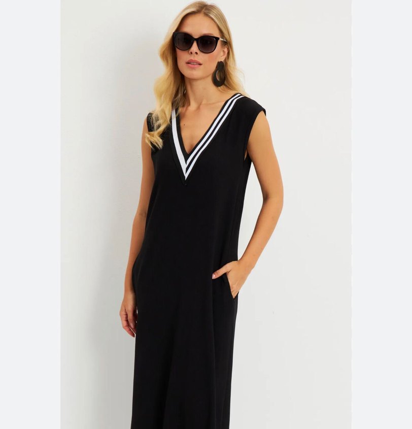 #TRENDYOL V yaka ve parlak detaylı, kolsuz, siyah midi elbise. Fitted kesimli İki kol arası 42 boy 86