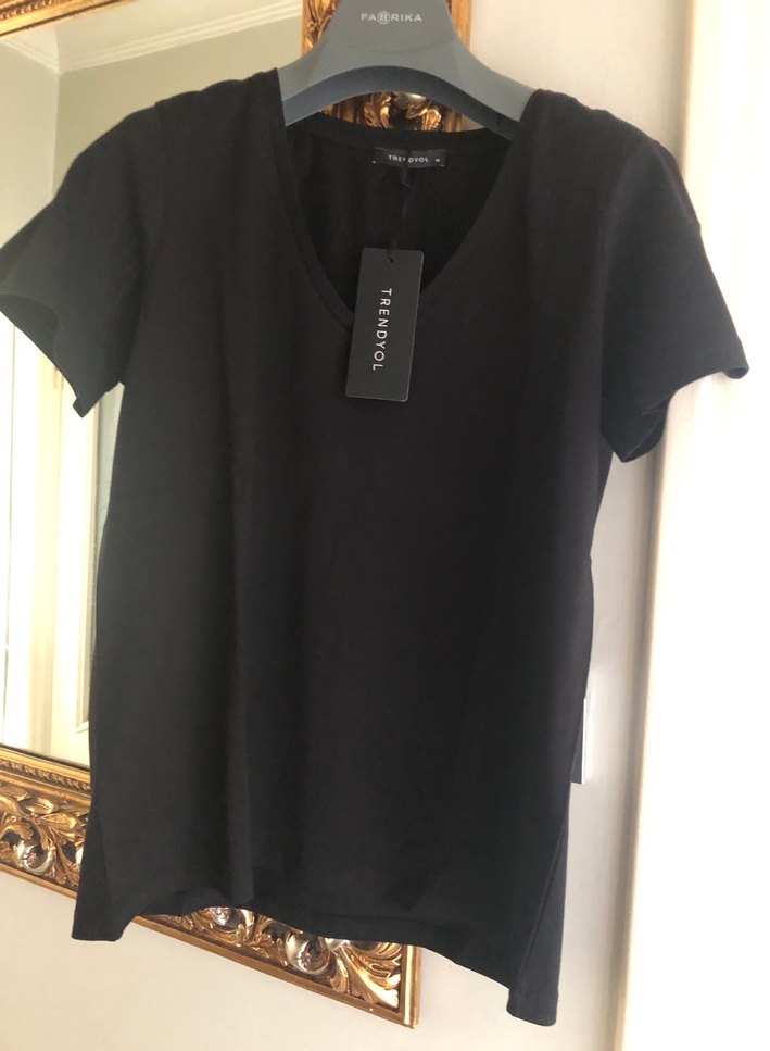 Sıfır üründür.. Paketiyle gönderilecektir.. S-L beden arası uyumludur.. Rahattır.. Pamuklu penye kumaştır.. Terletmez..Siyah renkli, V yaka kadın tişörtü, düz ve sade tasarıma sahip, rahat ve yumuşak kumaş kullanılmıştır.