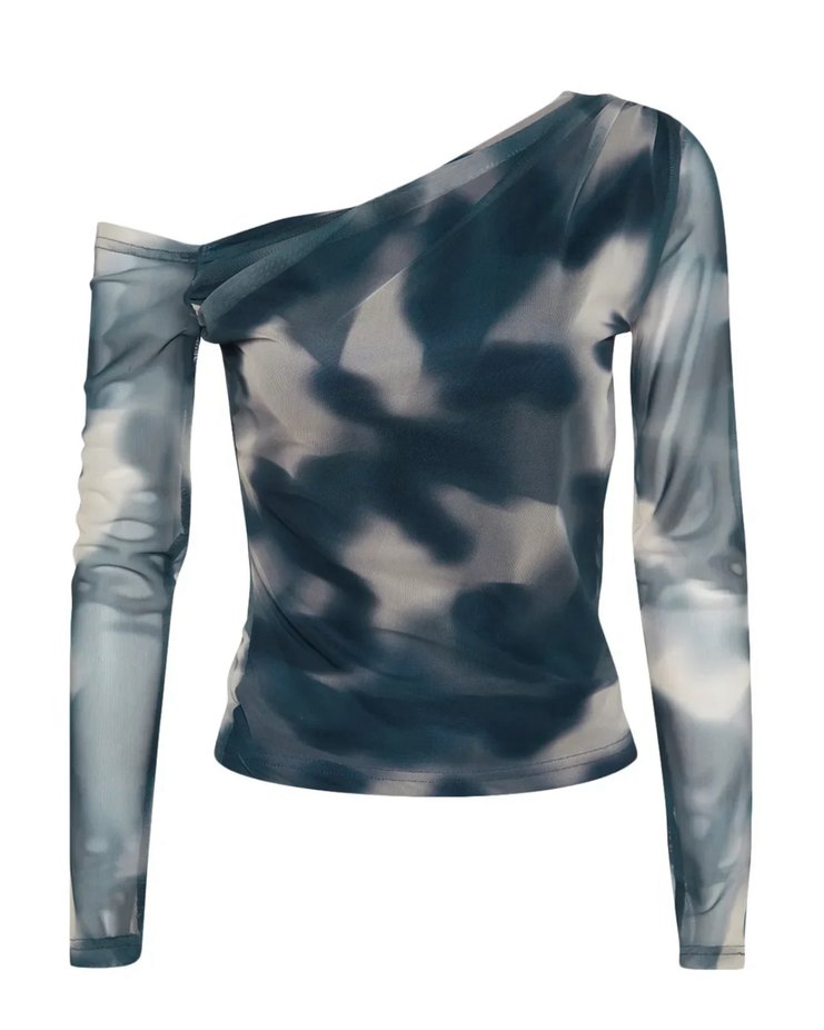 Tek omuz uzun kol Drapeli ve desenli, uzun kollu, drapeli ve straplez yakalı, yumuşak sentetik kumaştan yapılmış kesimde bluz.