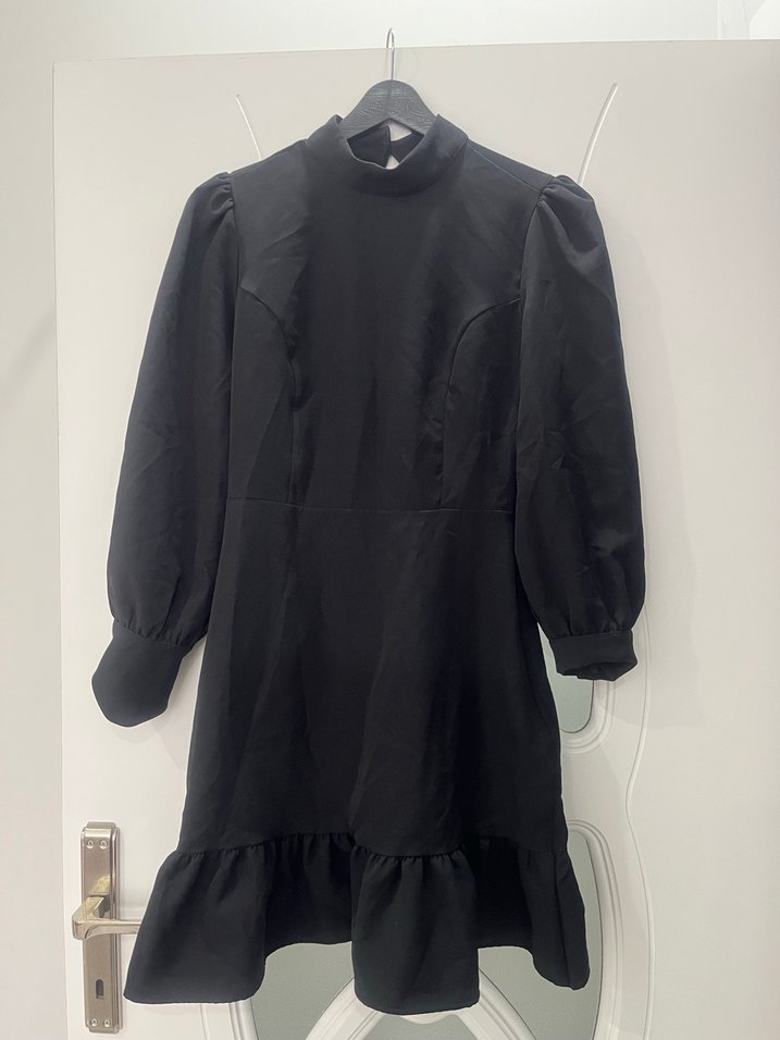 Yüksek yakalı, uzun kollu ve bol kesim siyah midi elbise, etek ucunda fırfır detaylarıyla trend goth tarzını yansıtıyor.