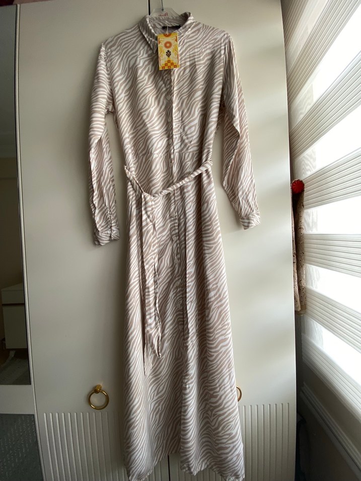 Elbise hiç giyilmedi. Vizyon krem renkli desenli boydan düğmeli gömlek elbise. Beli incecik gösteriyor belden aşağı hafif bollaşıyor. Elbise bana dar geldi ve İade süresi geçtiği için iade edemedim. 36-40 bedene uyar. İnternet görselini en sona koydum.