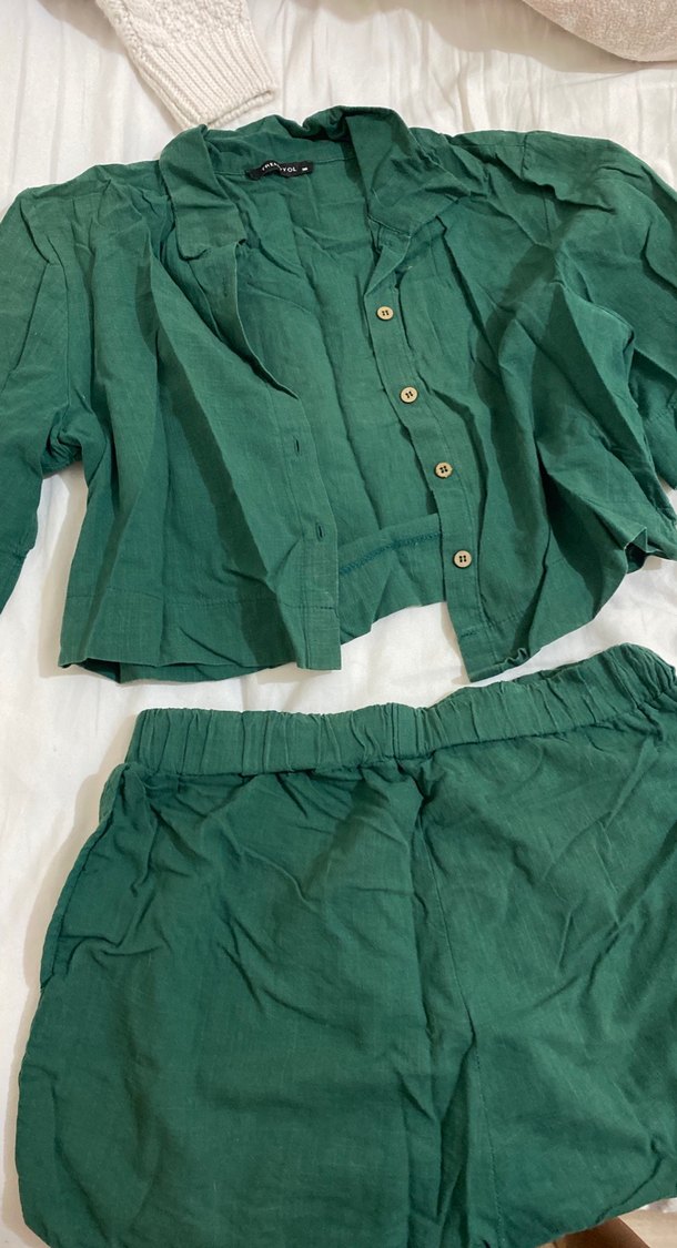Yeşil renkte, düğmeli kısa kollu %100 pamuk gömlek şort takım. Takım olarak gönderilecektir. Ütüleyince yazın kurtarıcı bir parça. Rengi ilk fotoğraftaki gibi. Hiçbir kusuru yoktur.