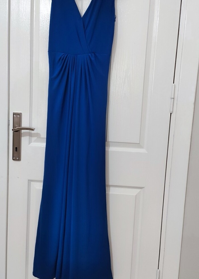 Saks mavi Hiç giyilmedi göğüs kısmı açık olduğu için terzide kapatmıştım dikişleri açılabilir ağır bir kumaşı var astarlı asla iç göstermez 1.60 tan uzunsanız yüksek topukluyla giyince kısa kalabilir