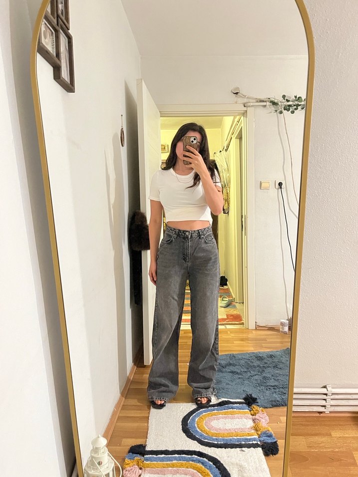 Gri kot pantolon, bağlama desenli ve rahat kesim, günlük kullanıma uygun şık ve rahat bir tasarım sunar. Nerdeyse hiç giyilmedi