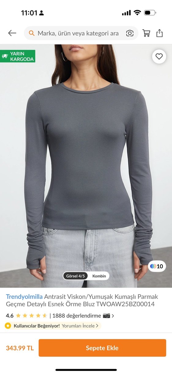 Trendyolmilla marka, antrasit gri renkli, parmak geçme detaylı, uzun kollu, esnek ve yumuşak kumaştan üretilmiş, günlük sokak stiline uygun fitted bluz.