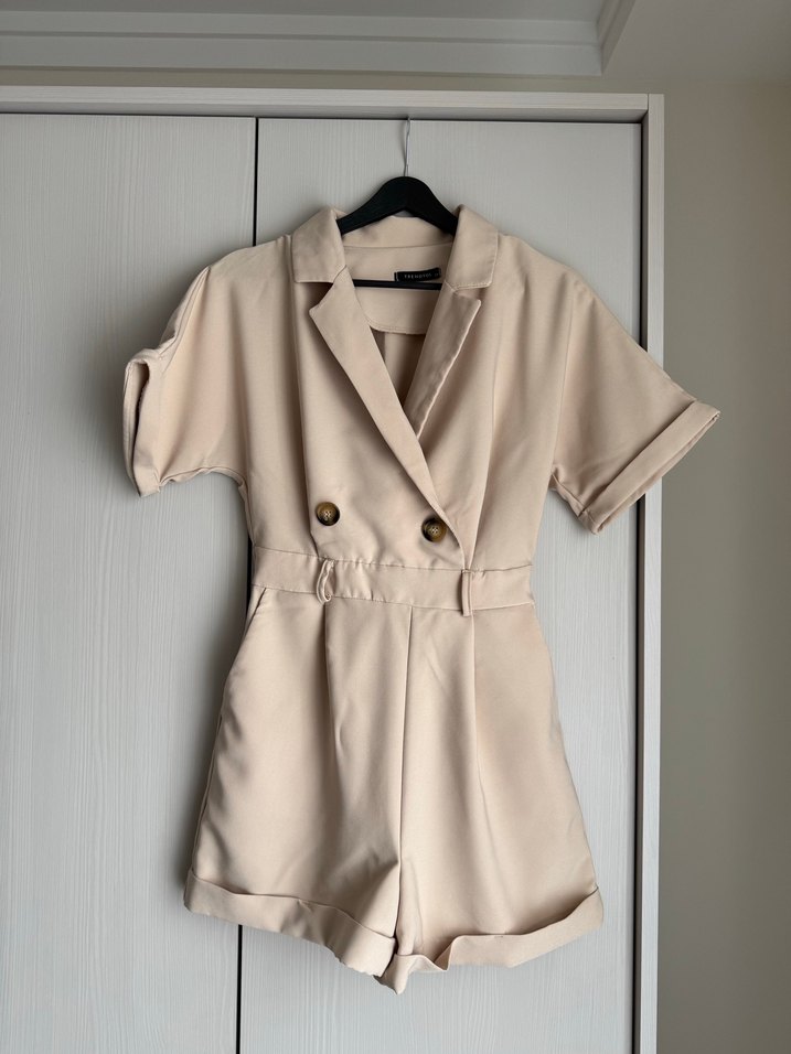 Bej renkli, kısa kollu, düğmeli mini kadın tulumu. Sadece 1 kez giydim, kemeri yok
