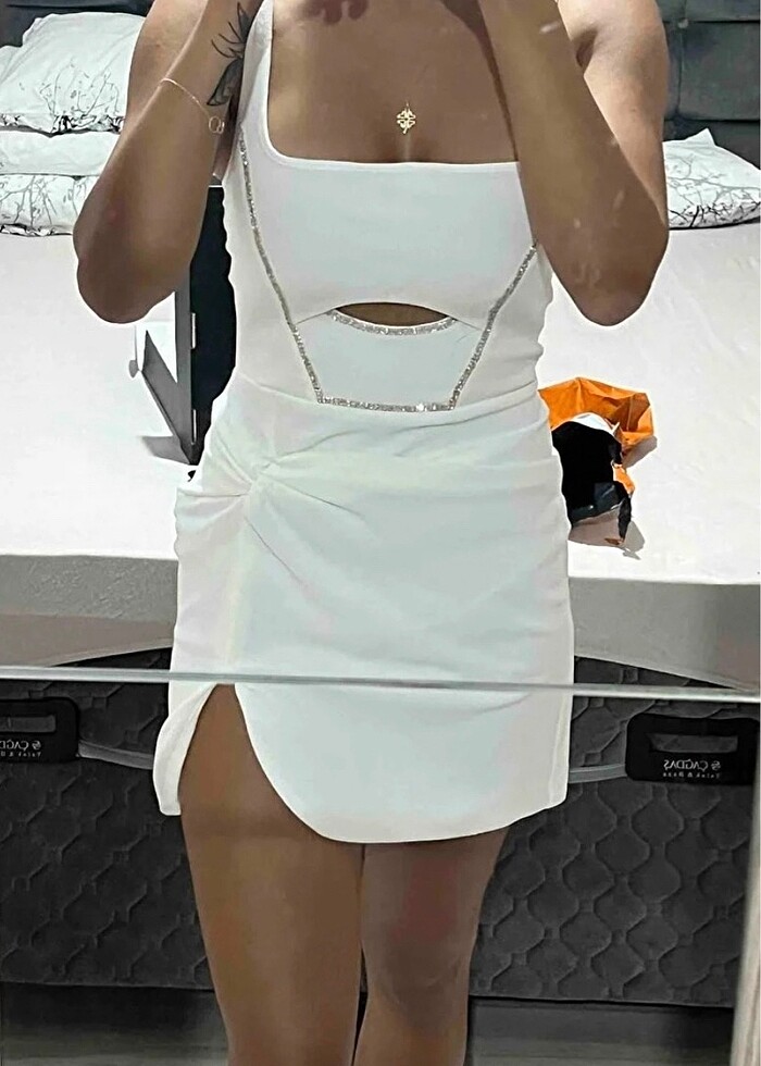 Beyaz mini elbise. Çok şık bir parça. Mezuniyetimde bir kere giydim.