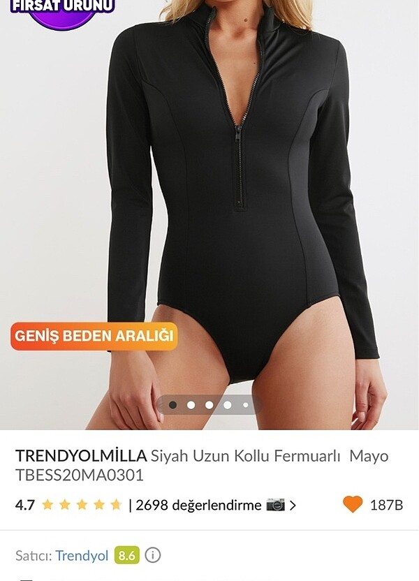 Fermuarlı uzun kollu mayo. Fakat bodysuit olarak da kullanılabilir. Etiketi üzerinde hiç kullanılmadı.