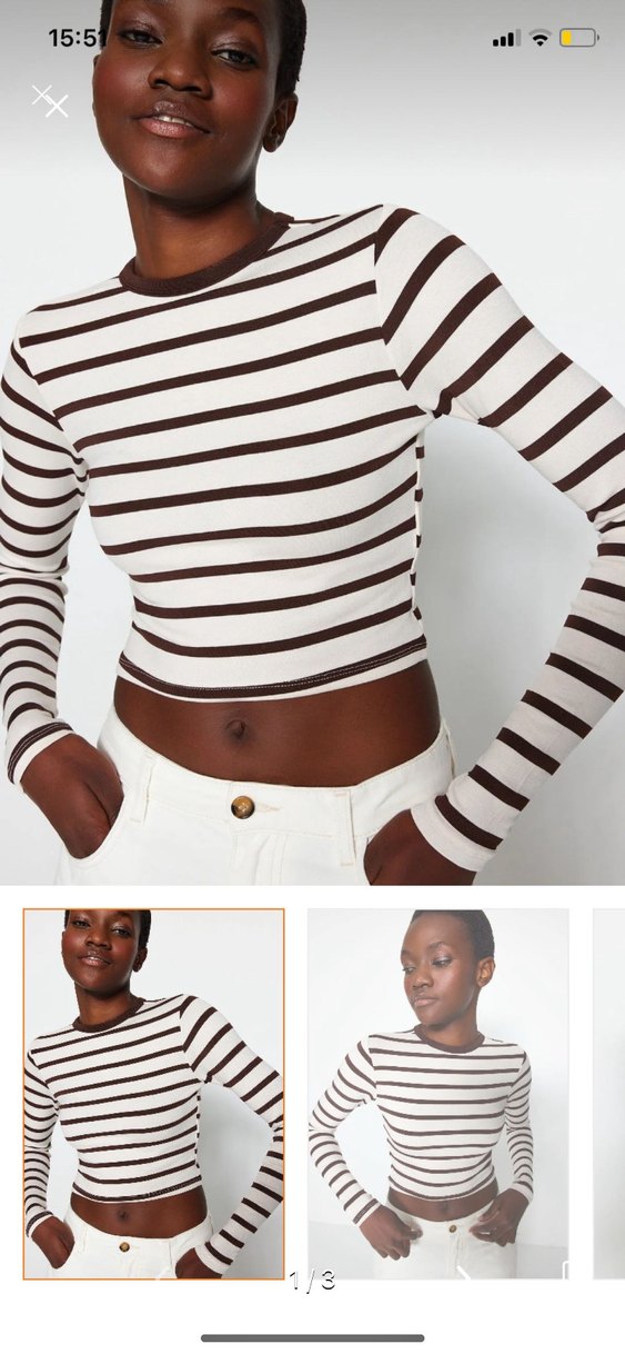 Pamuklu kumaştan, uzun kollu ve bisiklet yaka, beyaz zemin üzerinde açık kahverengi çizgili, günlük kullanıma uygun, rahat ve şık crop top. Kullanılmadı