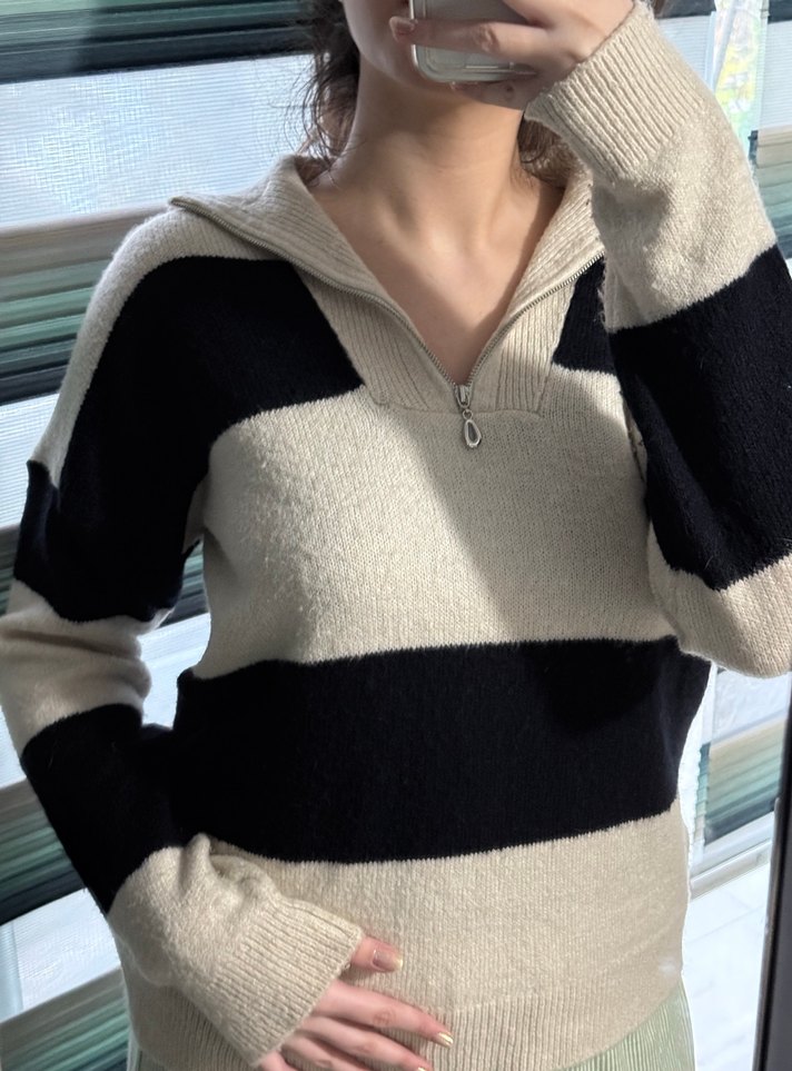 İki koltuk arası 54 boy 60cm. M beden. Lacivert ve ekru yarım fermuarlı triko kazak.