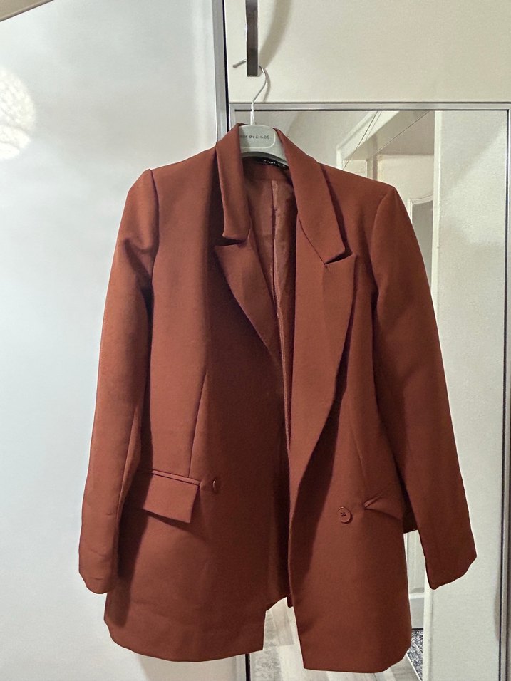 Kahverengi, düğmeli, normal boy midi kadın blazer ceket. Notch yakalı, sentetik kumaştan, ofis ve günlük şıklık için uygun. Strappy kollu, düz desensiz. Trendyolun favori ceketlerinden 2-3 kere giymişimdir. Dolapta durmktn bazı yerleri tüylenmiş bu yüzden fiyatı uygun. Tüyleri temizleyip rahat kullanırsınız