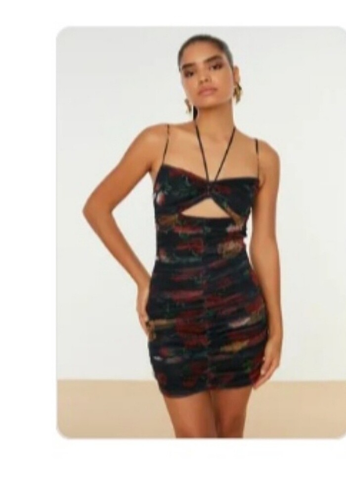 Elbise drapeli ve tül detaylı. İç gostermez. Kırmızılı yeşilli gül detaylari var. Çok şık bir gece elbisesi. Modelin boyu 175cm. Elbise 40 beden. 1 kez giyildi. Boynunda ipi var ben fotoğraflarda belli oluyor içine soktum kullanmak istemediğim için. Elbise esnek bir elbise bir üst veya alt bedene de olur. Markası TRENDYOLMİLLA artık satışı yok. Tekliflerinizi bekliyorum