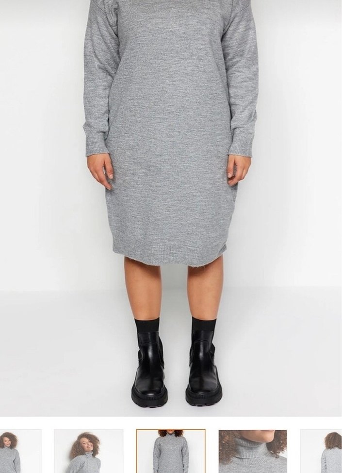 Gri renkli, uzun kollu ve yuvarlak yakalı triko elbise, rahat ve bol kesimdedir. Yumuşak ve sıcak kumaştan üretilmiş, günlük kullanım için zahmetsiz şıklık sunar.Hiç giyilmedi.