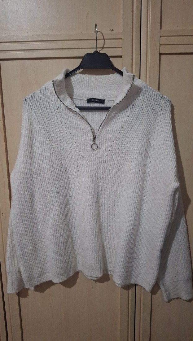 Gri renkli, yarım fermuarlı yüksek yakalı, uzun kollu, örgü kadın kazak. Rahat ve bol kesim, günlük kullanıma uygun sıcak bir model.