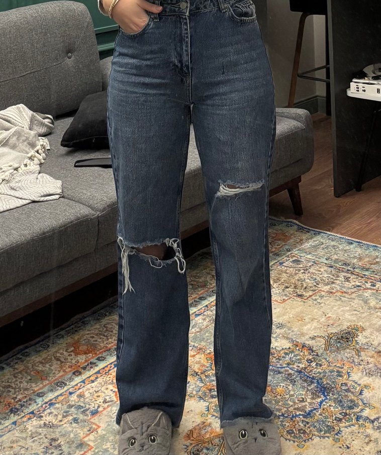 , salaş kesim kadın kot pantolon, bağlama detayı ve yırtık dizlerle sokak stiline uygun.