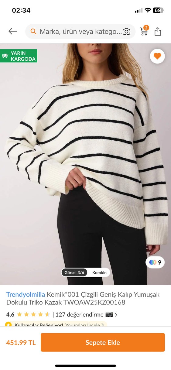 Trendyolmilla kazak, geniş kalıp, yuvarlak yaka ve uzun kollu. Yumuşak dokulu, çizgili ve açık renkli triko kumaştan, rahat sokak stiline uygun. Bir kez giyildi . Kalçayı kapatıyor tesettüre uygun