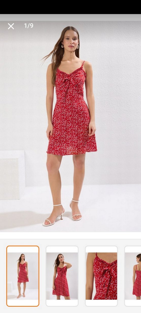 İnce askılı, V yaka kırmızı mini elbise, viskon kumaş pamuk 38 beden ama 36 giyene daha iyi olur hiç giyilmedi dar geldiği için.