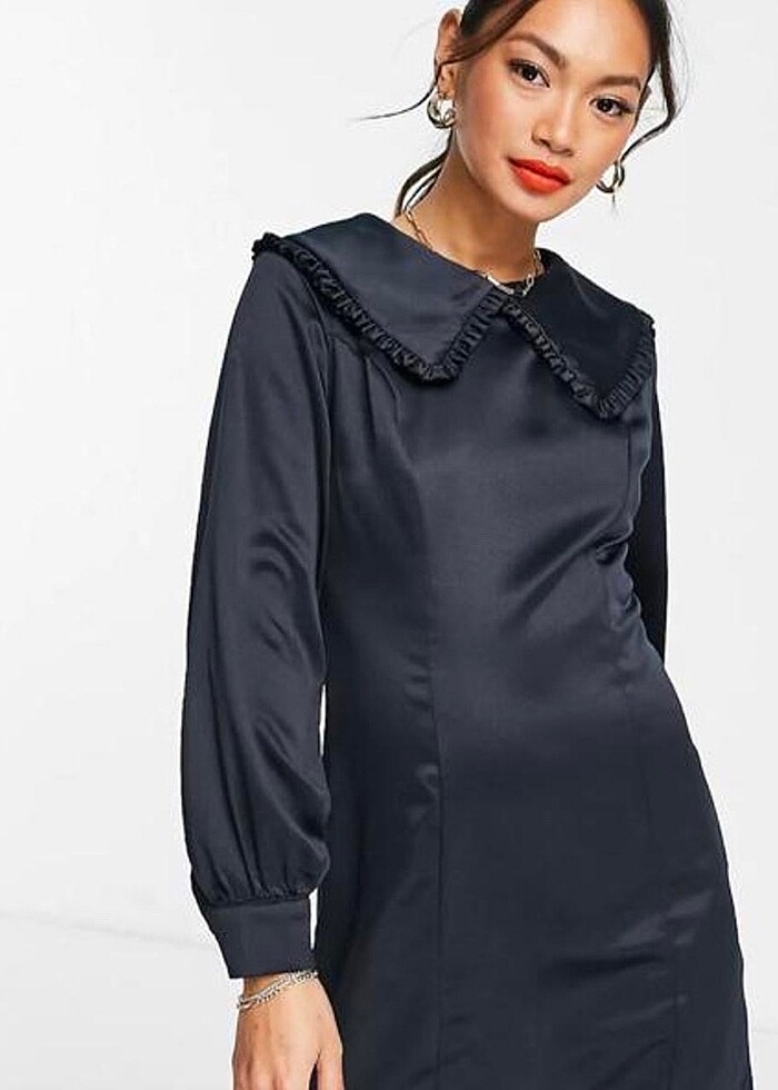 34 beden koyu lacivert saten vücuda oturan kalem elbise tarzında çok şık bir parça bebe yaka detayı çok şık. Kolları hafif bol balon kol tarzda. Arkasında fermuarı var o şekilde kolayca giyilebilir esneme payı azda olsa vardır. İçinde astarı mevcut iç göstermez. Bedeni uymadığı ve değişim süresini kaçırdığım için hiç giyilmedi etiketi üzerinde deformasyonu yoktur. Sorularınız için yazabilirsiniz.