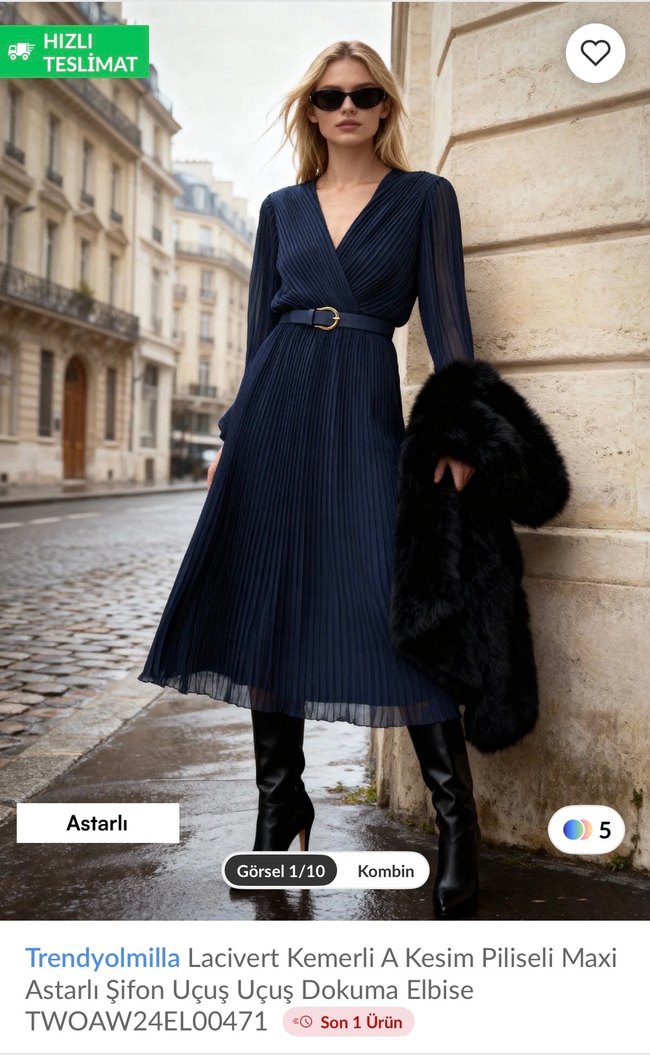 Trendyolmilla markasının lacivert kemerli, A kesim, piliseli uzun elbisesi. 2-3 defa giyildi, hiç bir kusuru yok.
