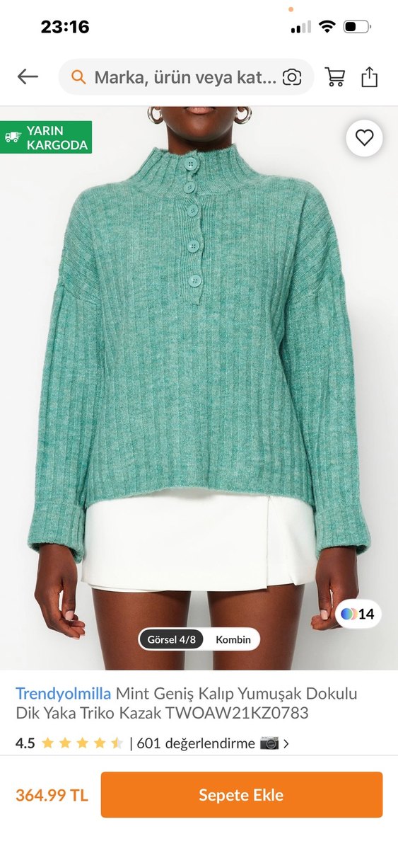 Yumuşak dokulu mint renk, geniş kalıp, kısa boy ve düğmeli ön detaylı, yüksek yakalı kazak. Rahat sokak stili için uygundur.