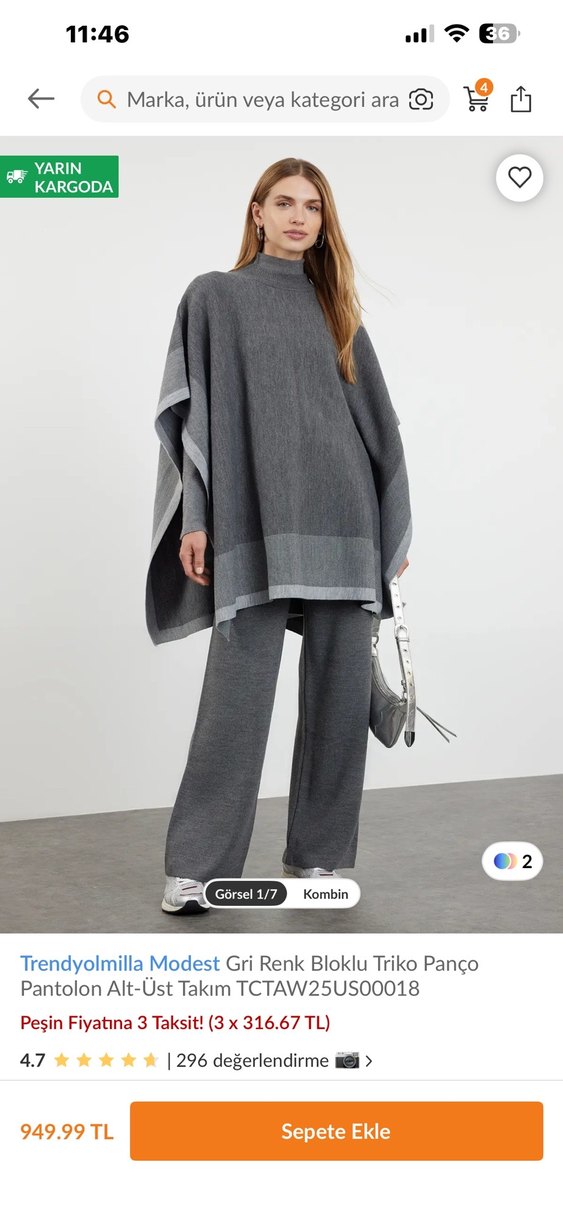 Trendyolmilla Modest gri renk bloklu triko panco ve bol kesim, normal boy sentetik kumaş pantolon takımıdır. Rahat ve gündelik kullanıma uygundur. Hiç Giymedim çok yeni 900 küsüre aldım çok güzel fakata bana olmadı takım olarak ikisi